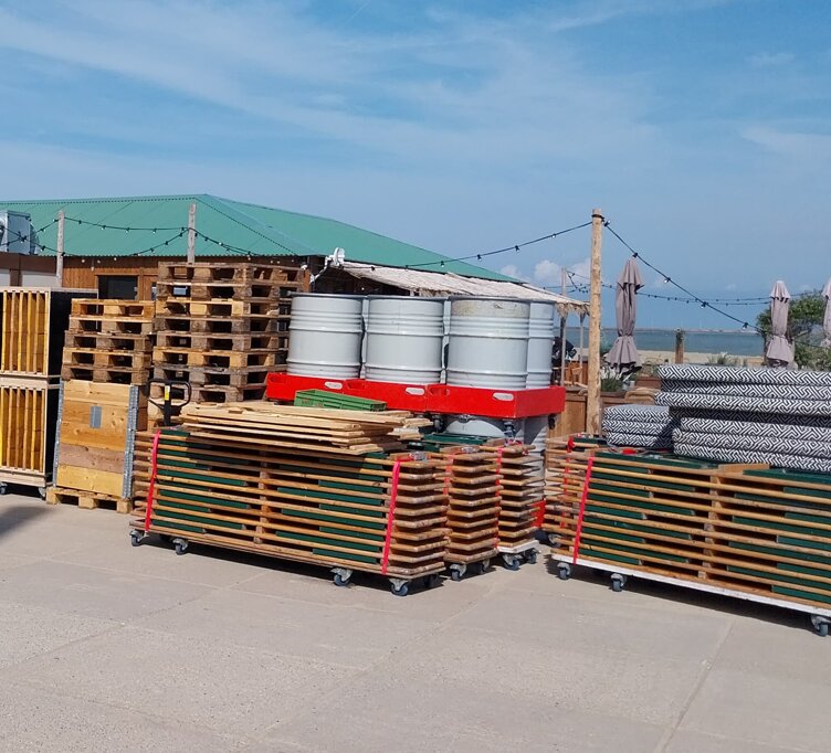 ✅ Totaal 5 complete sets op 1 transportkar en dan aan beide kanten de rode spanbanden vastsjorren.