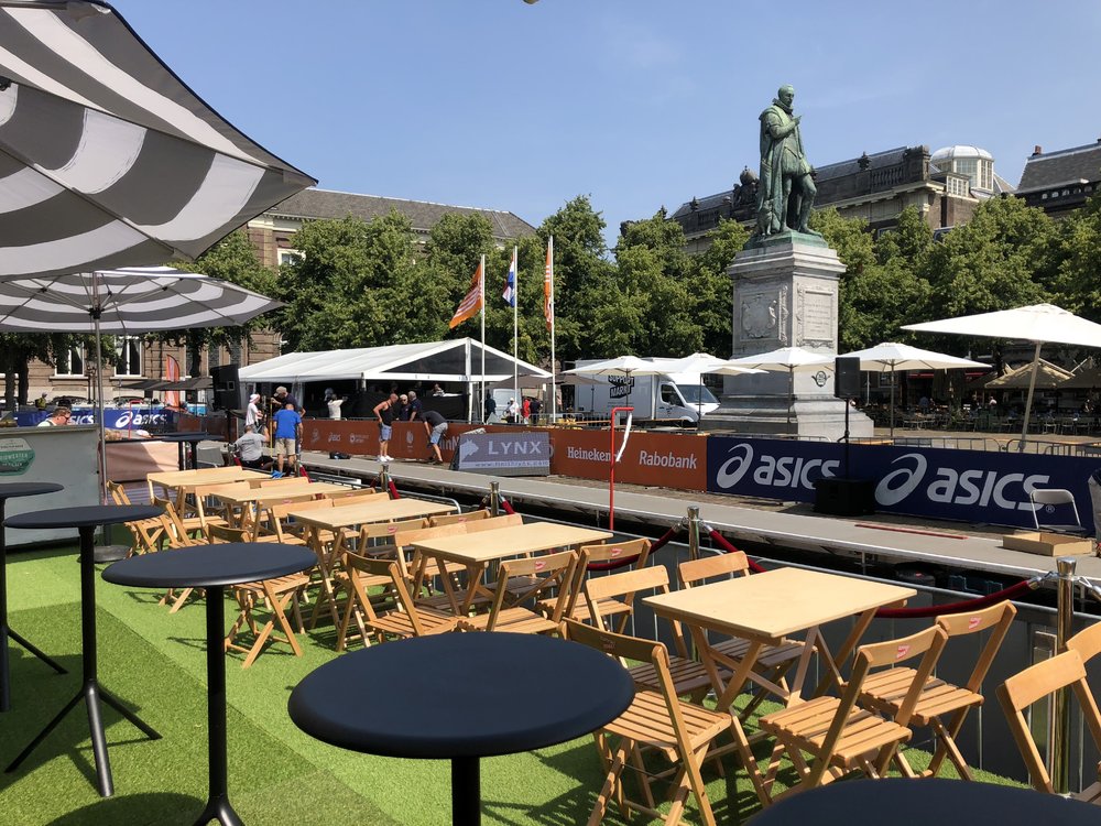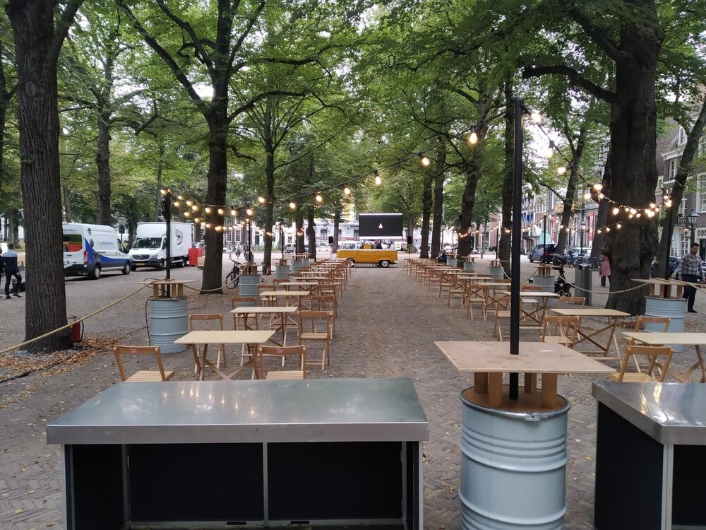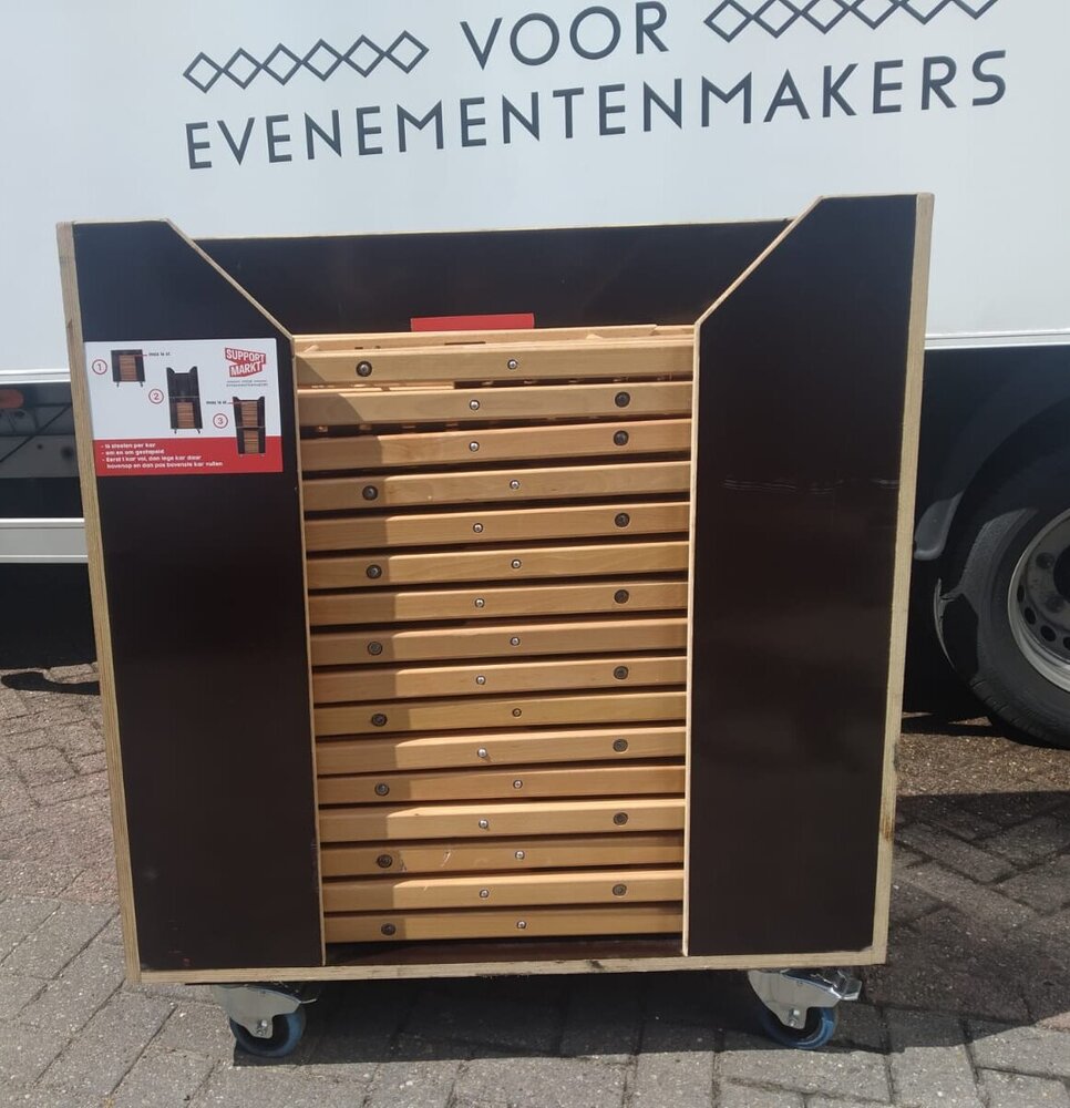 De bistrostoelen gaan per 16 stuks in een transportkar en de bistrotafels gaan per 8 stuks in een transportkar.