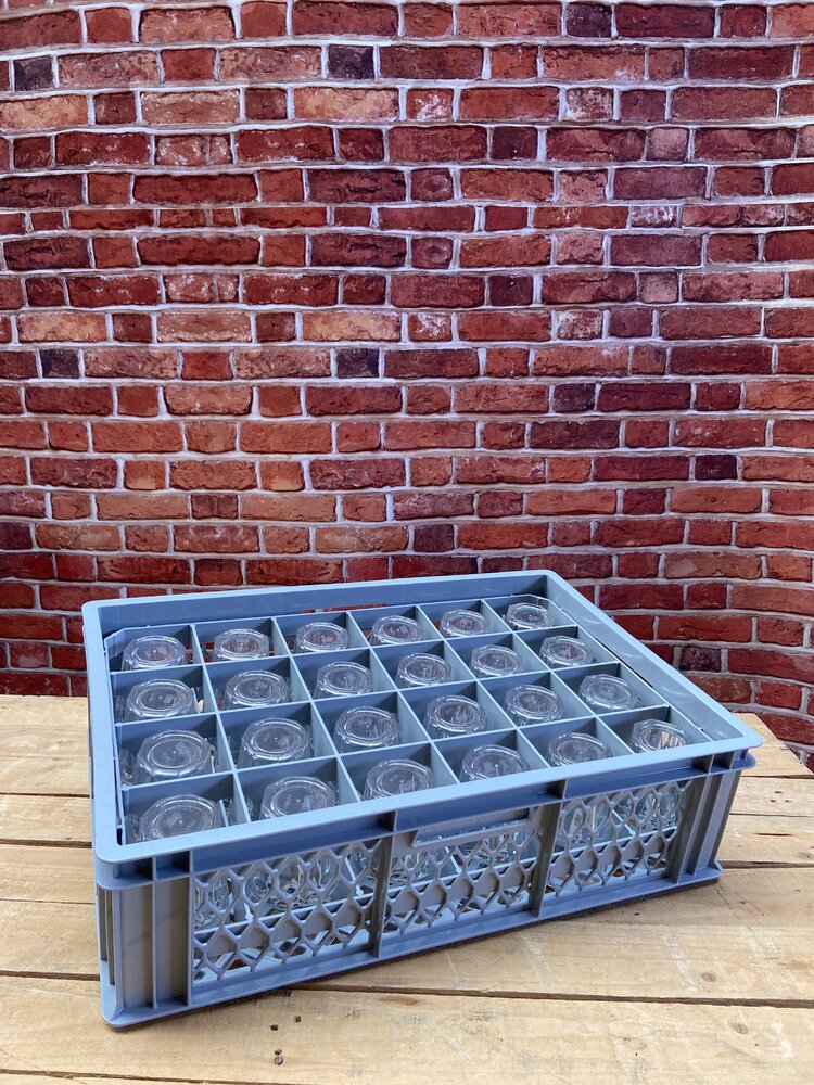Er zitten 24 stuks glazen in een krat van 60 x 40cm en op een rolcontainer passen 20 kratten van 60 x 40cm = 480 glazen. [ Bij verlies of schade wordt achteraf een vervangingswaarde berekend ]