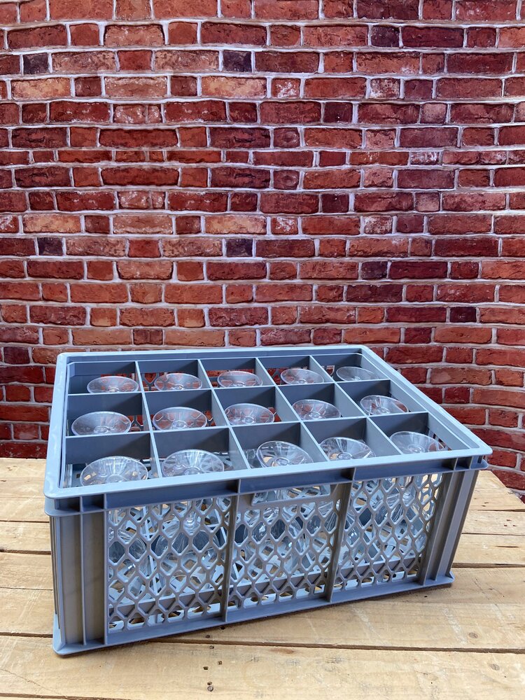Er zitten 15 stuks glazen in een krat van 60 x 40cm en op een rolcontainer passen 12 kratten van 60 x 40cm = 180 glazen. [ Bij verlies of schade wordt achteraf een vervangingswaarde berekend ]