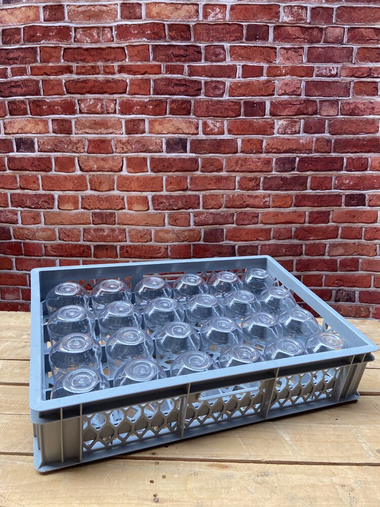 Er zitten 24 stuks glazen in een krat van 60 x 40cm en op een rolcontainer passen 26 kratten van 60 x 40cm = 624 glazen. [ Bij verlies of schade wordt achteraf een vervangingswaarde berekend ]