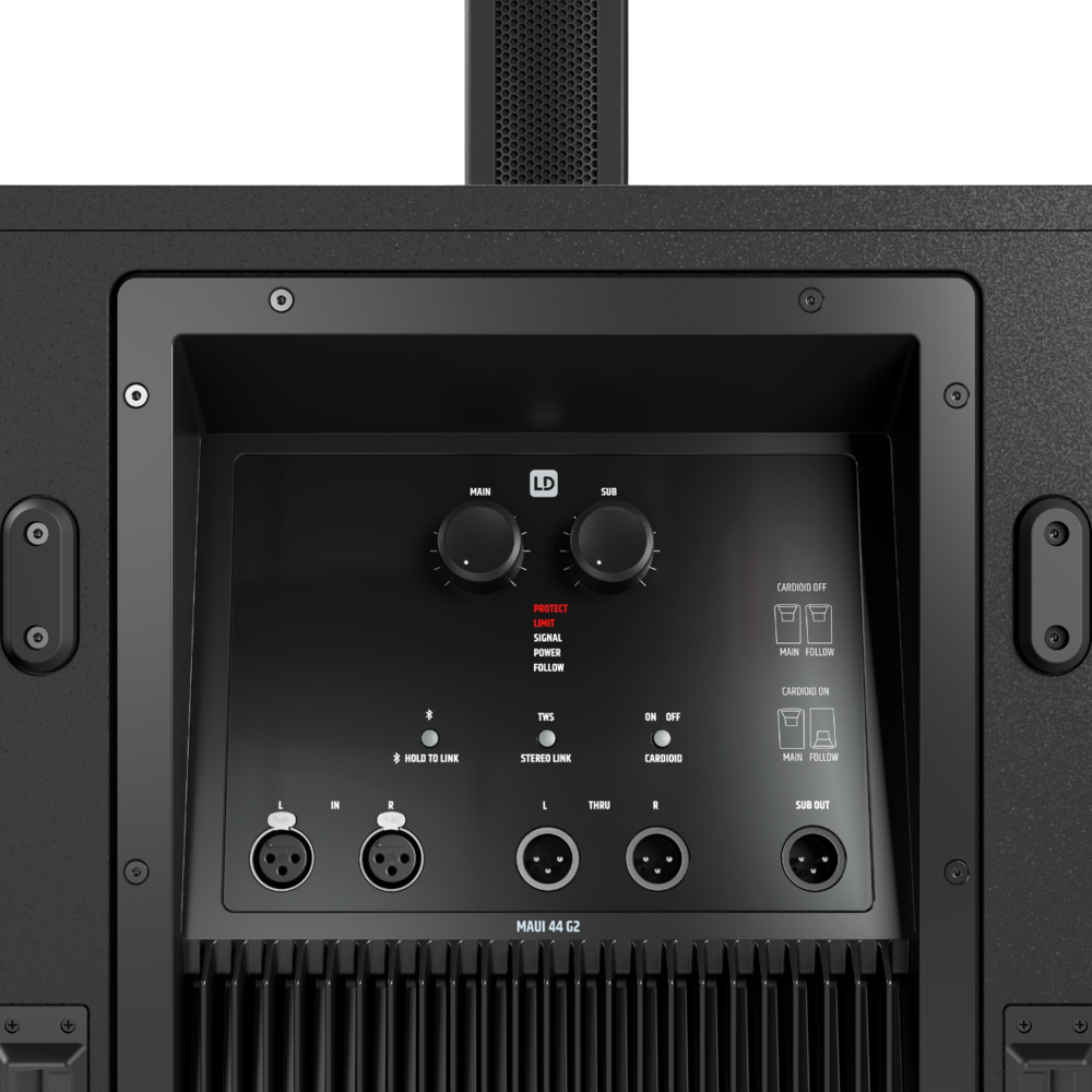 Ook qua gebruikersgemak springt het LD Systems MAUI 44 G2 column P.A.-systeem er uit. Het komt met een ultra-betrouwbare PowerCon voedingskabel en via de Sub Out kun je, desgewenst, nog een extra subwoofer toevoegen. Verder komt er geen kabel te pas bij het aansluiten van dit systeem. Alle delen sluit je op elkaar aan met de speciaal ontworpen multi-pin connectoren, en klaar ben je. De Dynx DSP herkent automatisch de delen en zet alle instellingen klaar voor je. Met TrueWireless stereo technologie maak je, compleet draadloos, met een druk op de knop een stereo-opstelling van twee MAUI 44 G2’s.