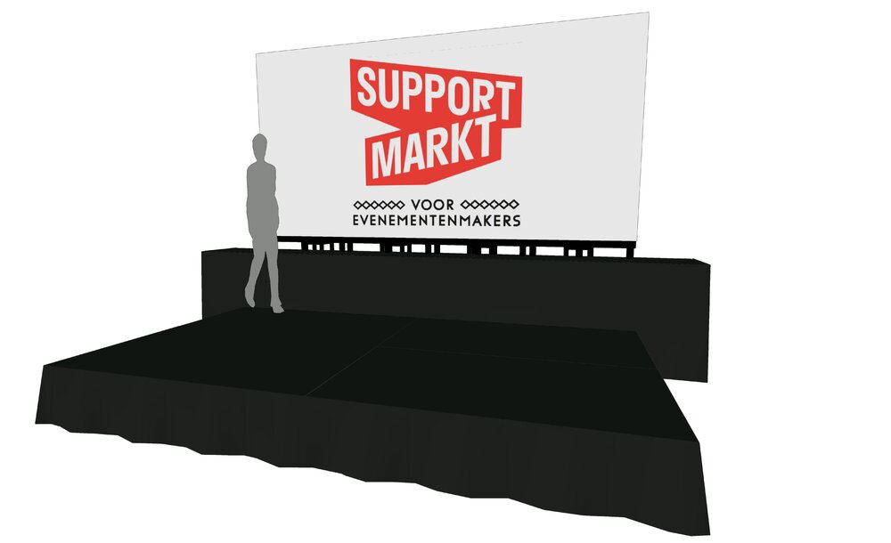 Huur dan een LED-scherm van Supportmarkt opgehangen aan trusspalen voor binnengebruik, compleet met een professioneel podium! Afmeting van deze Set : “Ledscherm 2 x 4m met podium 2 x 4m + verhoging 0,5 x 5m”