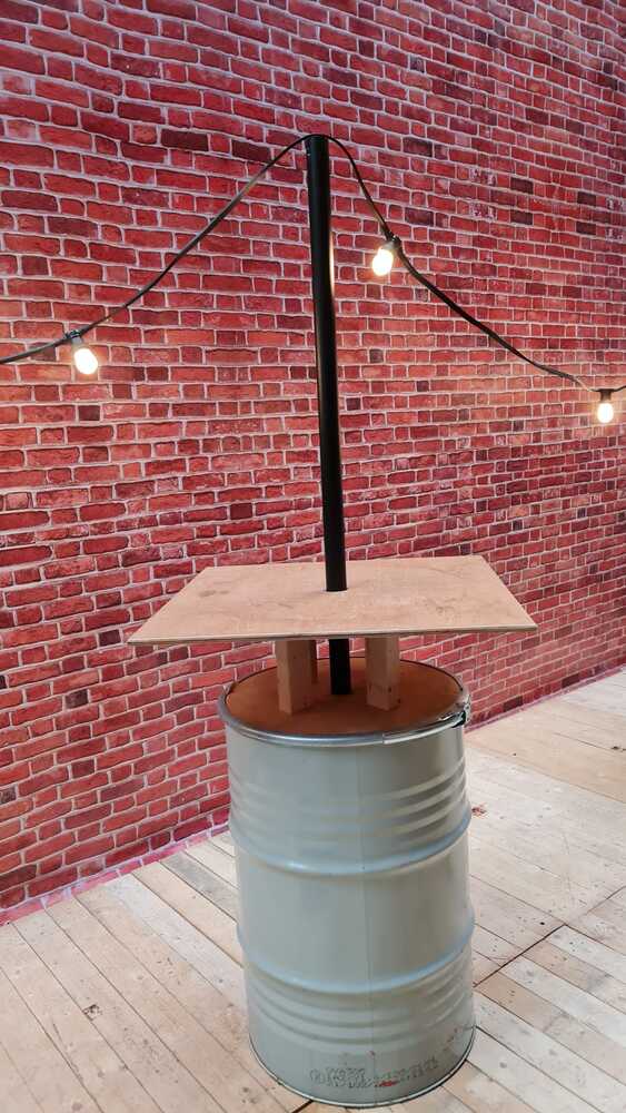 De OlieTonTon statafel is een statafel maar kan ook gebruikt worden met een zwarte buis in het midden van het blad. Aan deze buis kan dan van alles bevestigd worden van signingbordjes, prikkabel, verlichting, etc…….